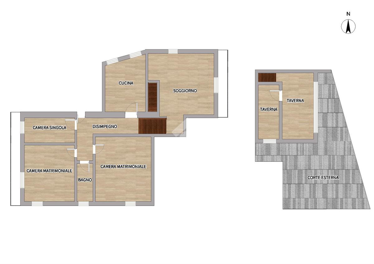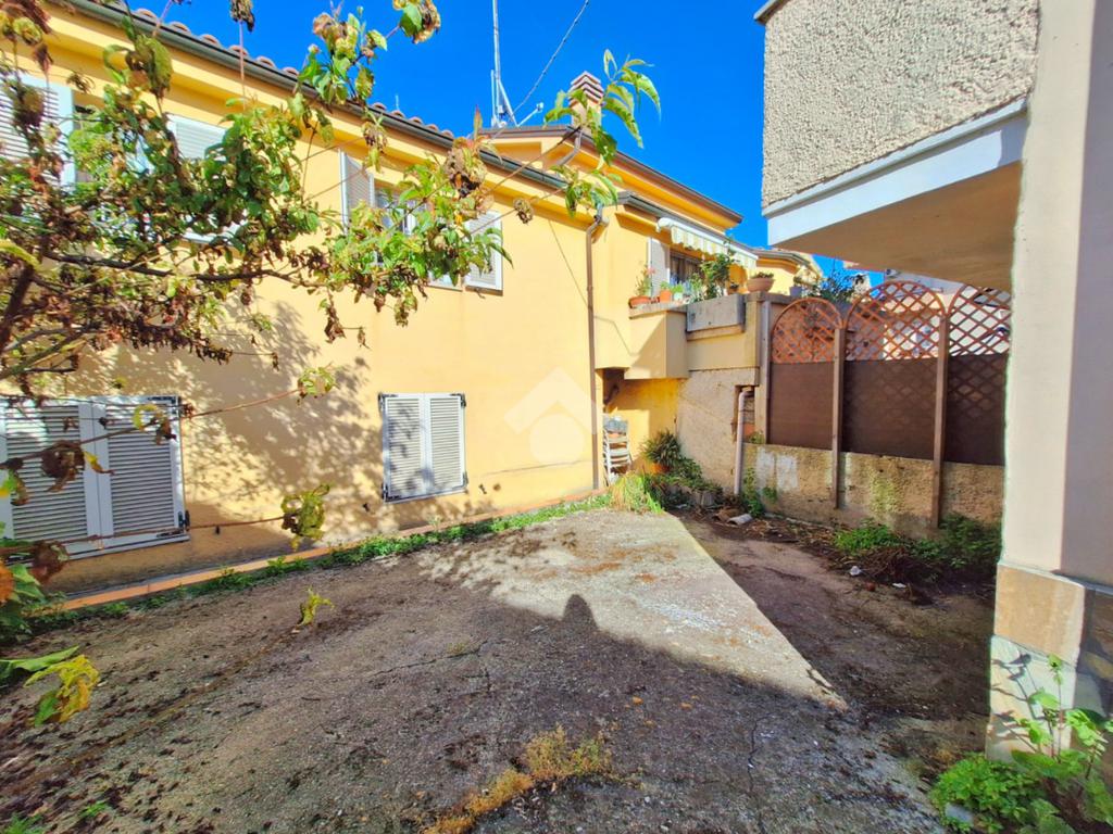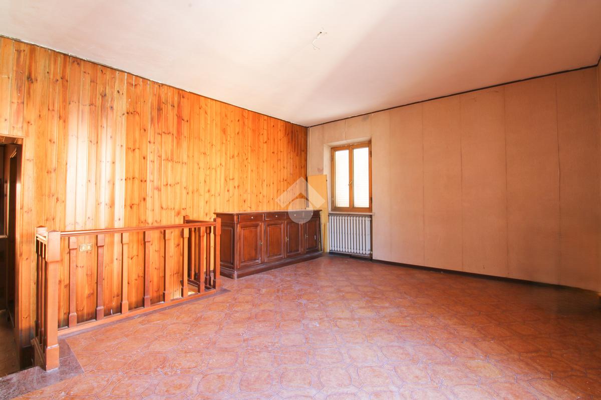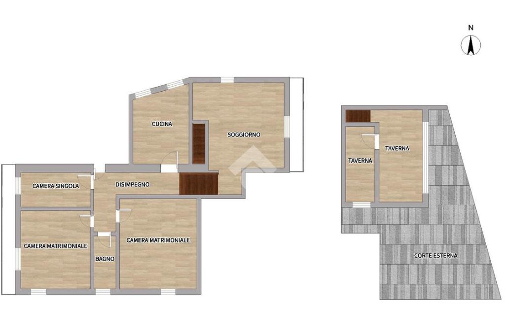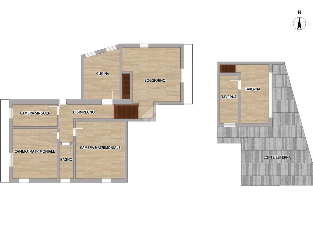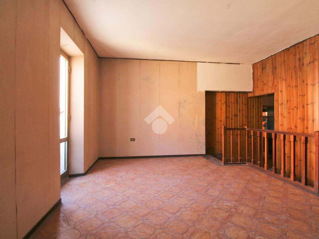 La scala interna conduce al piano inferiore, dove si trova una taverna spaziosa con camino. Questo ambiente è perfetto per organizzare cene con amici o per essere utilizzato come spazio versatile secondo le esigenze della famiglia. Da qui, si ha accesso diretto alla corte esterna, un angolo di serenità ideale per godere di momenti all'aria aperta.