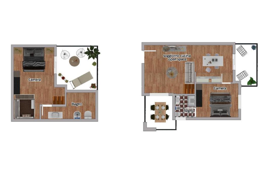 All'ingresso, sarete accolti da un soggiorno cucina open space, un ambiente che ispira convivialità e relax. I due terrazzi annessi sono il luogo ideale per pranzi e cene all'aperto, regalando momenti di puro piacere e relax. completa il piano la camera matrimoniale con bagno privato