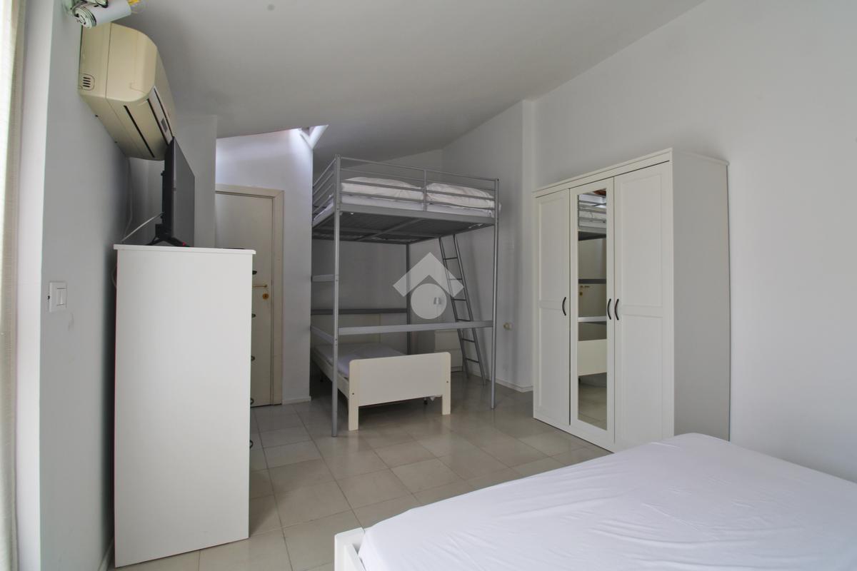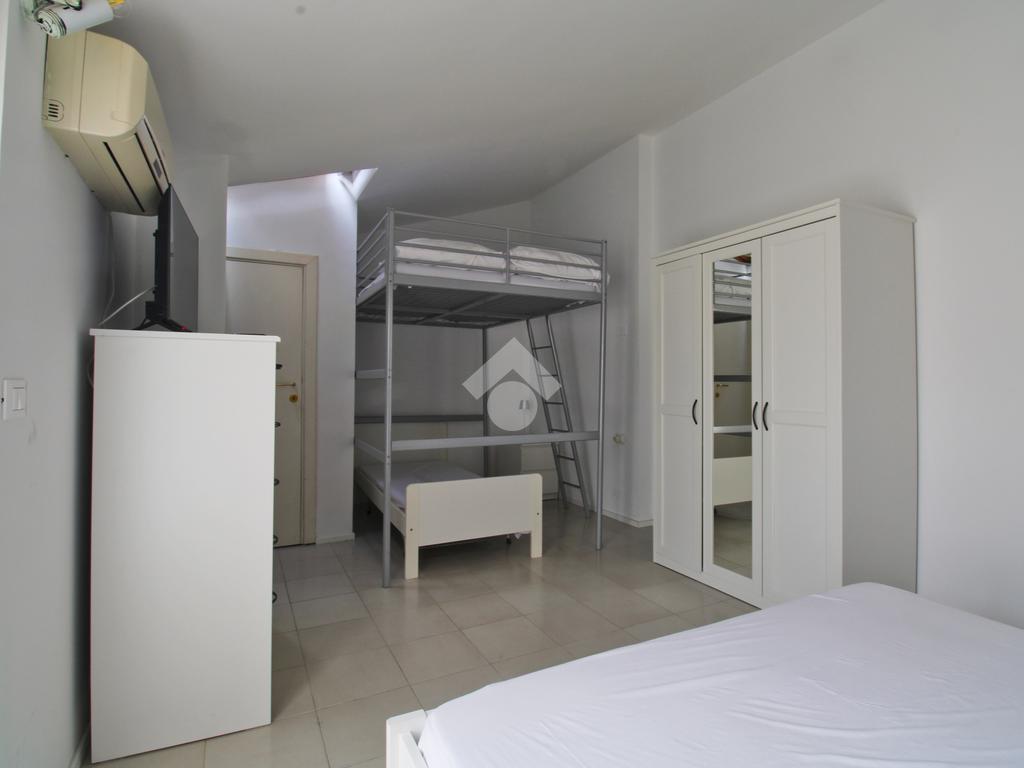 Ritornando nella zona giorno, una scala conduce al piano superiore, dove troviamo la seconda camera che accoglie un letto matrimoniale e un pratico letto a castello, ideale per ospitare famiglie o amici. Anche qui, troverete un bagno aggiuntivo e un terrazzo che offre una vista mozzafiato sul Monte Conero, una cornice perfetta per iniziare la giornata con una nota di bellezza naturale.