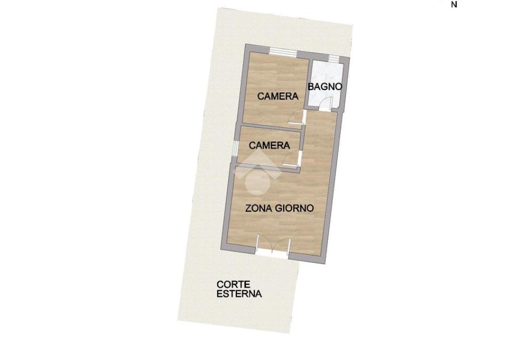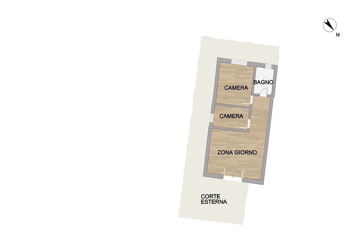 L'immobile si compone di un ingresso soggiorno con angolo cottura funzionale, una luminosa camera matrimoniale, una camera singola e un bagno finestrato con box doccia. Completa la proprietà una corte esterna, perfetta per godere delle giornate all'aria aperta e una cantina a cui si accede dall'esterno.
