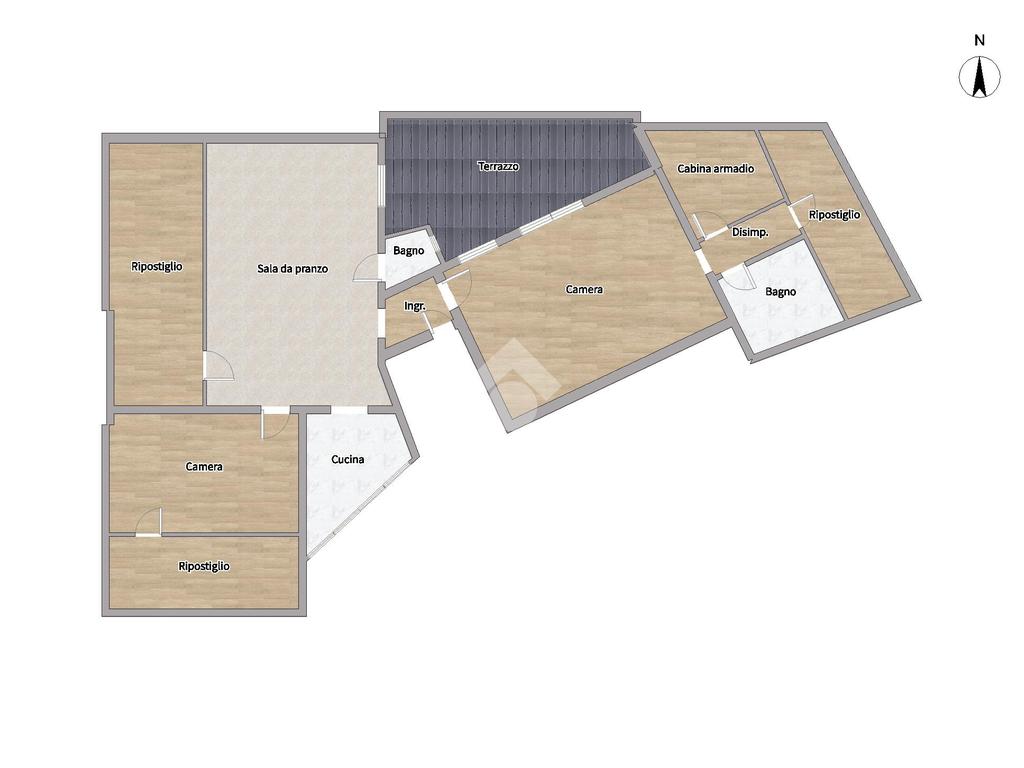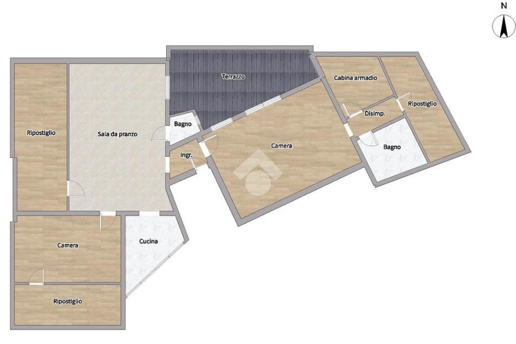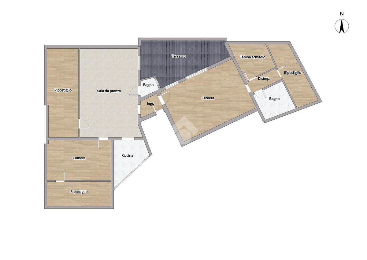 L'accesso avviene tramite un piccolo disimpegno che introduce alla zona giorno, uno spazio progettato per massimizzare il comfort e la convivialità. La cucina si apre sulla sala da pranzo con bagno di servizio da cui si accede anche al generoso terrazzo, perfetto per godere di momenti all'aperto, completa la zona giorno una camera da letto.